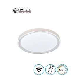 גוף תאורה צמוד תקרה דגם RAFAEL SLIM קוטר 50 ס”מ 75W הפעלה, שינוי גוון אור ועימעום באמצעות שלט CCT לבחירת גוון אור רצוי: 3000K – אור חם, 4000K – אור נטרלי, 6500K – אור יום, 5W – תאורת לילה. צבע לבן עם חצי מסגרת עץ OMEGA